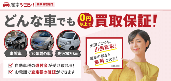 廃車ツヨシでは、全国どこでも出張買取や自動車税の還付、廃車手続き代行無料など、廃車の買取に特化したサービスです。