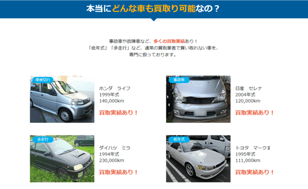 ナビクル廃車買取では、20年以上前の車、車検切れ、事故車、故障車、動かない車など、どんな車でも買い取ってくれます。