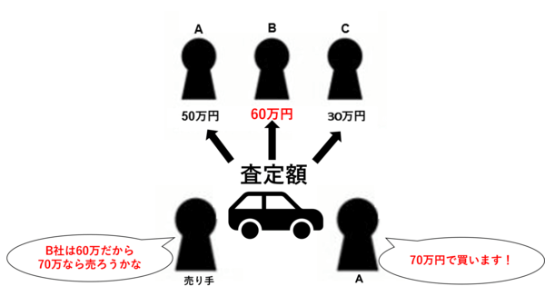 A社に査定を出したところ、50万円でした。B社にも査定を出したところ、60万円でした。A社に対して「B社では60万円だったのでそれ以上なら売りたい」と伝えました。そうするとA社は「70万円出すので売ってください!」と査定額を上げてくれました。